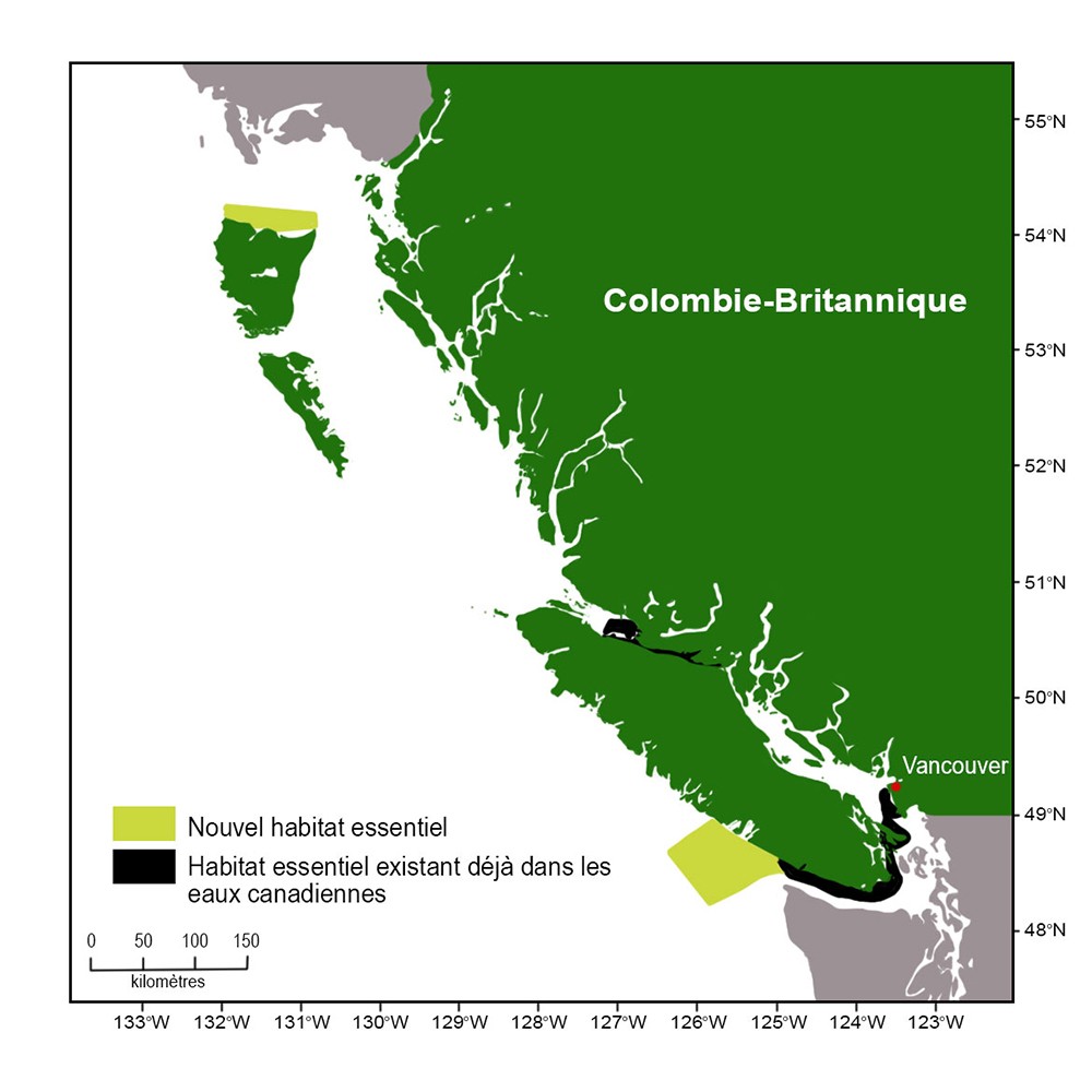 Les zones d’habitat essentiel nouvellement désignées se trouvent dans les eaux au large de la côte sud-ouest de l’île de Vancouver, y compris les bancs Swiftsure et La Pérouse, et dans la partie ouest de l’entrée Dixon, où s’alimentent les deux espèces d’épaulards résidents. Ces nouvelles zones vont permettre d’accroître la zone d’habitat essentiel des épaulards en voie de disparition d’environ 6 419 kilomètres carrés à une zone d’environ 10 714 kilomètres carrés dans les eaux canadiennes. La désignation de ces zones comme « habitat essentiel » garantit qu’elles seront légalement protégées contre toute destruction pouvant nuire à leur survie ou au rétablissement des baleines.