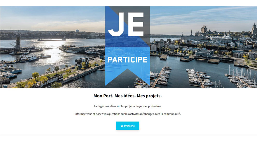 Localisé au cœur de la ville de Québec, le Port de Québec reconnait la nécessité de travailler en collaboration avec les communautés avoisinantes pour une cohabitation harmonieuse ville-port. Intitulée Je participe, la nouvelle plateforme a été conçue pour encourager les échanges avec les citoyens et bénéficier de leur expertise comme usagers des services et des espaces publics du port.